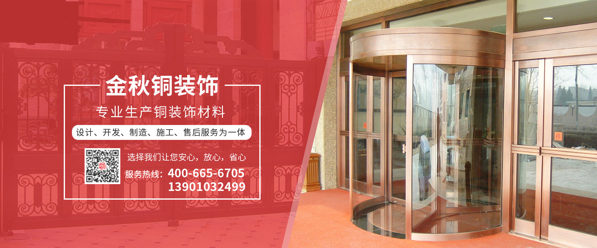 北京金秋銅裝飾材料有限公司是專業(yè)生產(chǎn)銅裝飾材料及設(shè)計、開發(fā)、制造、施工、售后服務(wù)為一體的大型綜合企業(yè)??沙薪咏ㄖ~裝飾工程及五星級酒店、別墅、博物館、樓樘管所等高檔銅裝飾項目;生產(chǎn)各種規(guī)格的旋轉(zhuǎn)門、平滑門、別墅門、電控門、工藝門、旋轉(zhuǎn)護欄、屋頂銅飾防水瓦、浮雕壁畫......